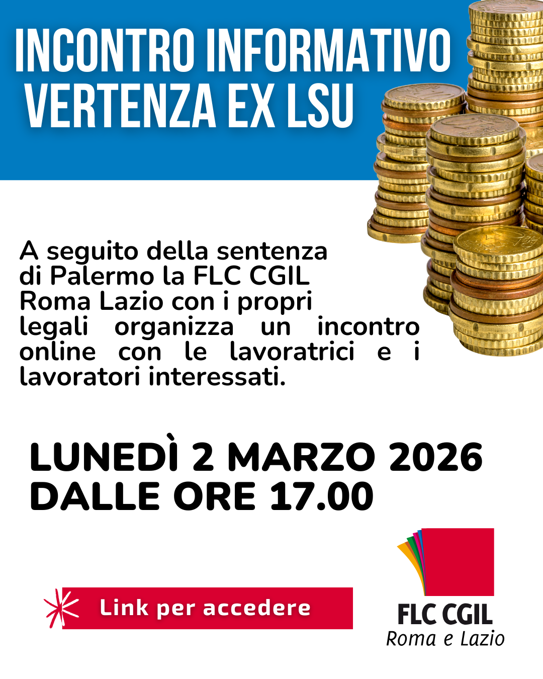 FLC CGIL Assemblea Sindacale Assemblea Online – lunedì 2 marzo 2026 ore 17,00 – ore 19,00 – Vertenza ex-LSU