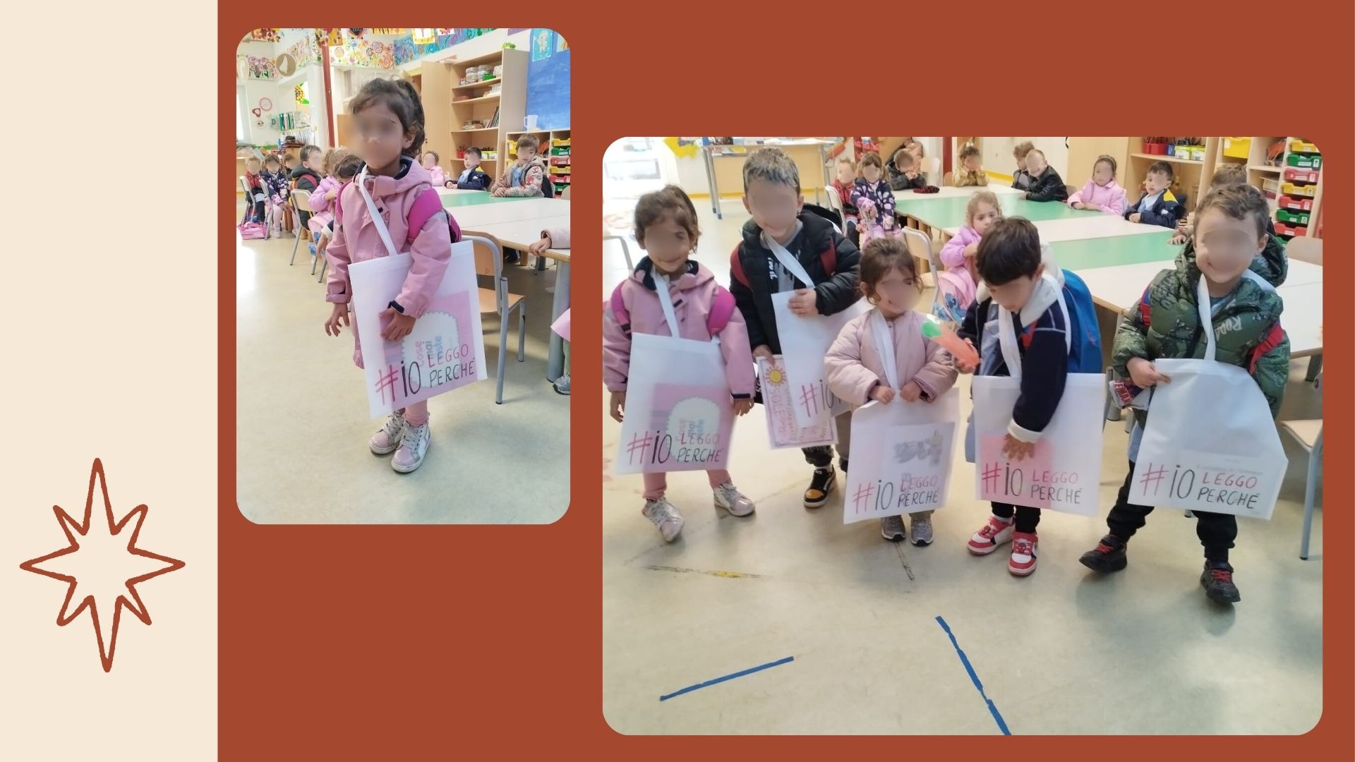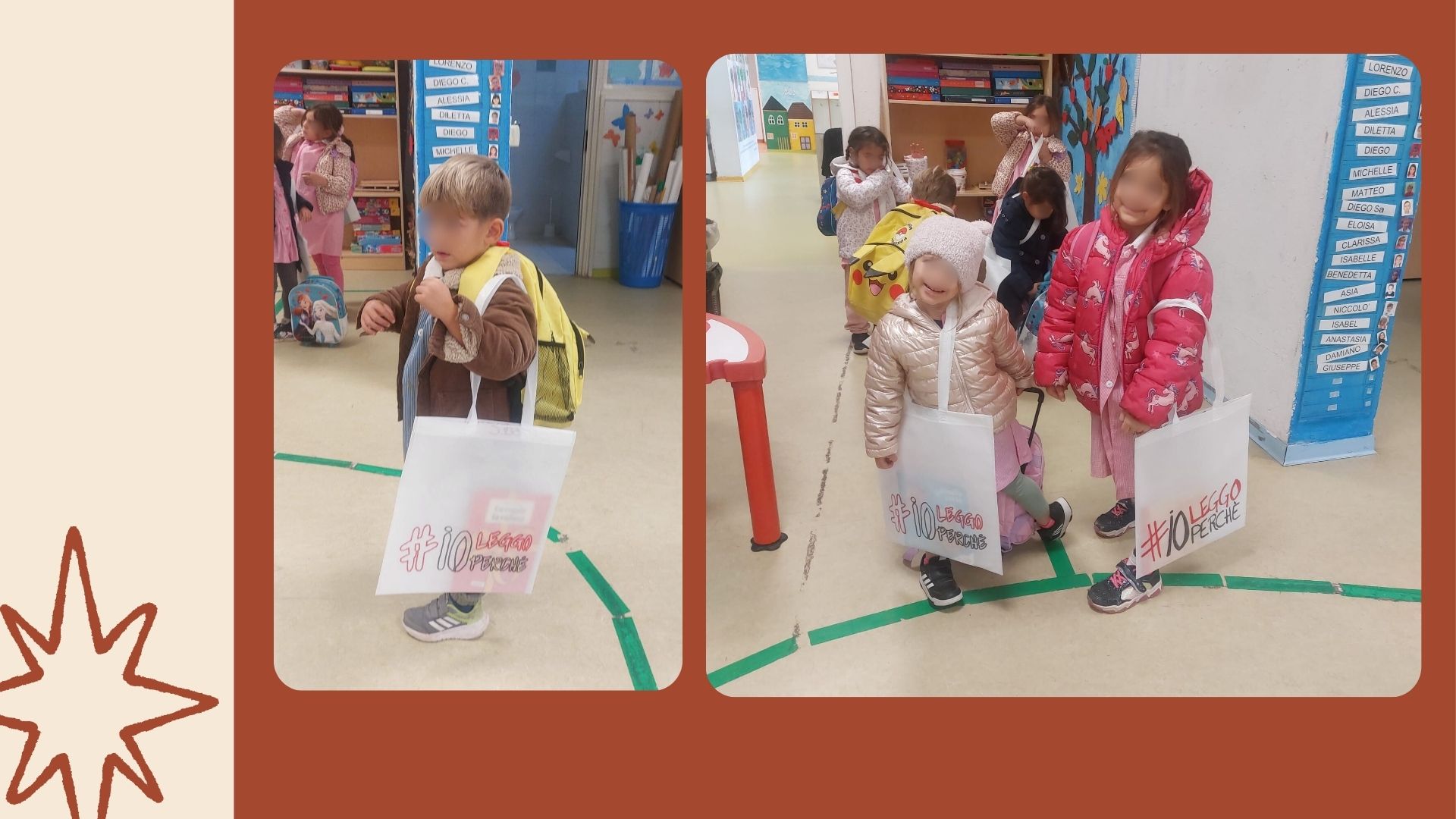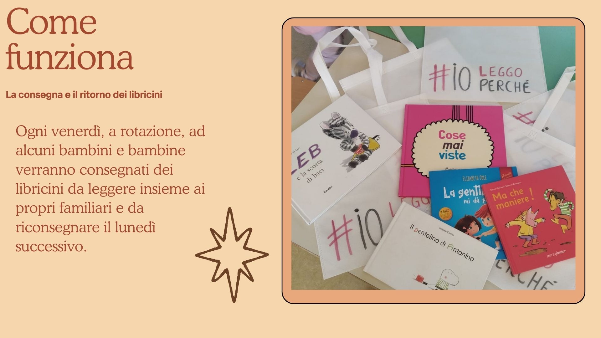 Ogni venerdì, a rotazione, ad alcuni bambini e bambine verranno consegnati dei libricini da leggere insieme ai propri familiari e da riconsegnare il lunedì successivo.
